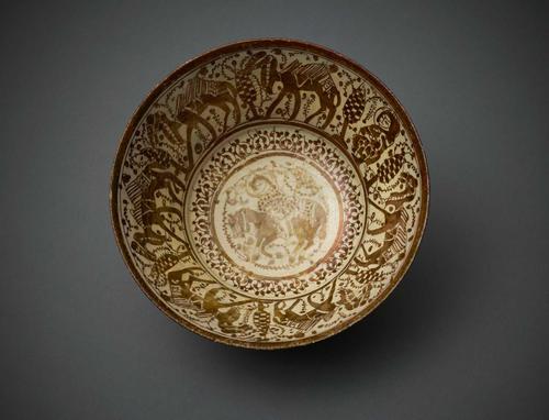 The mounted horseman — whether prince, hero, or warrior — remains one of the most common visual motifs in works of Islamic art. Here, the figure of a horseman is depicted at the centre of a conical bowl surrounded by a superb depiction of a merchant caravan. The sides of the bowl are decorated with six camels laden with bags led by an attendant. The artist has given the caravan a lively sense of animation, with the camels stepping forward to provide a feeling of motion that suits the circular nature of the vessel. The figures are rendered in metallic enamel paint that offers a golden lustrous sheen against the white background. Trees with a checkerboard pattern and branches with small leaves complete the landscape setting for the caravan. This style of fine depiction on thinly potted fritware ceramics was common in Kashan, Iran, in the late twelfth and early thirteenth centuries. There are many surviving examples, including a similar bowl in the Aga Khan Museum’s collection, where the central mounted figure is encircled by horses instead of the camel caravan.
