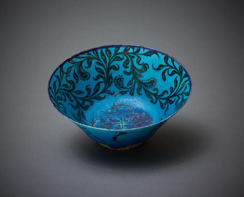 The development of a fritware ceramic (also known as stonepaste) in eleventh-century Iran revolutionized ceramic production, since it presented the opportunity to create a thinly potted white body that could easily be shaped and decorated. The new fritware ceramics could also be moulded into complex objects such as this conical bowl with its straight walls that are more suited to metalwork production. An early medieval recipe left by Abu’l-Qasem Kashani, a member of a family of potters, informs us that fritware is made out of ten parts ground quartz, one part ground glass, and one part fine white clay. The white body of this bowl is a perfect background for the combination of black-painted decoration and transparent turquoise glaze. The undulating stems of the water-weed motif on the sides of the bowl surround a school of fish painted in a thin brush, allowing for finer lines and elaborate flourishes.