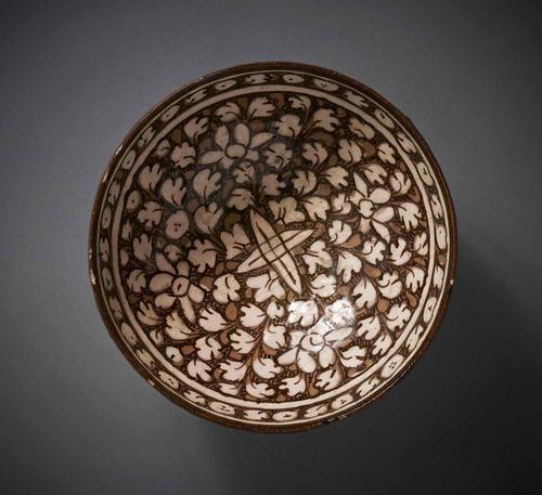 Textiles that were traded along the Silk Route were the most common way in which ideas and decorative motifs such as lotuses, dragons, and sphinxes were transferred between China and Iran. With the Mongol conquests of the thirteenth century, and the conversion of the Mongol Ilkhanid dynasty to Islam, Iranian potters began using these imported motifs in their designs. Here, the bowl is decorated with a mass of leaves surrounding lotus flowers. The bowl draws its influence from green-glazed stoneware known as celadon that was imported from China during the fourteenth century. The painted arcade panelling on the exterior of the bowl is a local rendition of the moulded form of the Chinese origin. This bowl, along with several other exquisite examples in the Aga Khan Museum’s collection, are attributed to the city of Sultanabad in western Iran.