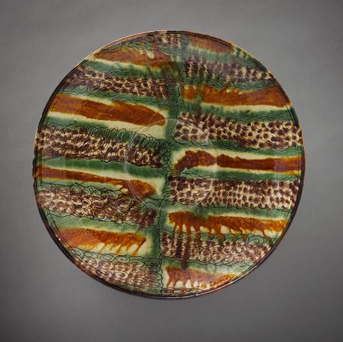This exceptional dish with its broad splashes of ochre, green, and brown glazes over a white background with an incised pattern is as pleasing to the eye as it is probing to the intellect. The similarity of its splashing effect and colours to the splash-painted wares (san-ts’ai) of the Tang dynasty (618–907) led to the assumption that this style was directly influenced by imports from China into the Abbasid realms of Iraq and Iran. Indeed, there is ample evidence that during the ninth century, potters in Abbasid Iraq tried to emulate the forms and visual effect of imported Chinese porcelain, which led them instead to use tin glaze to create a white background on earthenware. The Chinese splash-painted ceramics, however, were mainly developed as figurines and tomb goods and were not utilized in daily life. There is also no evidence they were ever exported to Iran where this intriguing dish was made. Could this be a case of exchange of ideas for which we have lost the evidence, or could it be the result of simultaneous development in design and glazing techniques?