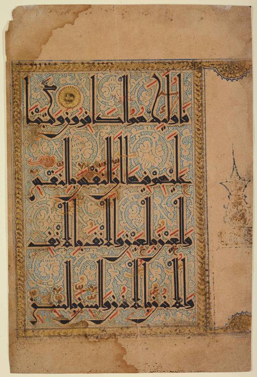 By the time this magnificent folio was copied in eastern Iran, the use of paper in a vertical format and the full pointing and vocalization of the text were already established standards (except in Spain). Here, all pointing and diacritic marks are written in the same ink and hand as the letter forms, while the vocalization is rendered in red, most probably after the text was copied. However, it is the design and layout of the folio that are most magnificent. The generous spacing between the lines and the graceful verticality of the uprights of the letters create a rhythm for the full decoration of the background. An ornamental palmette-scroll (arabesque) outlined in blue surrounds the text and takes pride of place on the page, with a miniature tight scroll filling the space in between. The gilded braid framing the page and the marginal finials give it a sophisticated finished look. It would have been an elaborate undertaking by a wealthy patron to commission and complete this thirty-volume dispersed Qur’an. Scholars have estimated that this Qur’an would have had approximately 4,500 pages, some of which are in prominent museum collections.